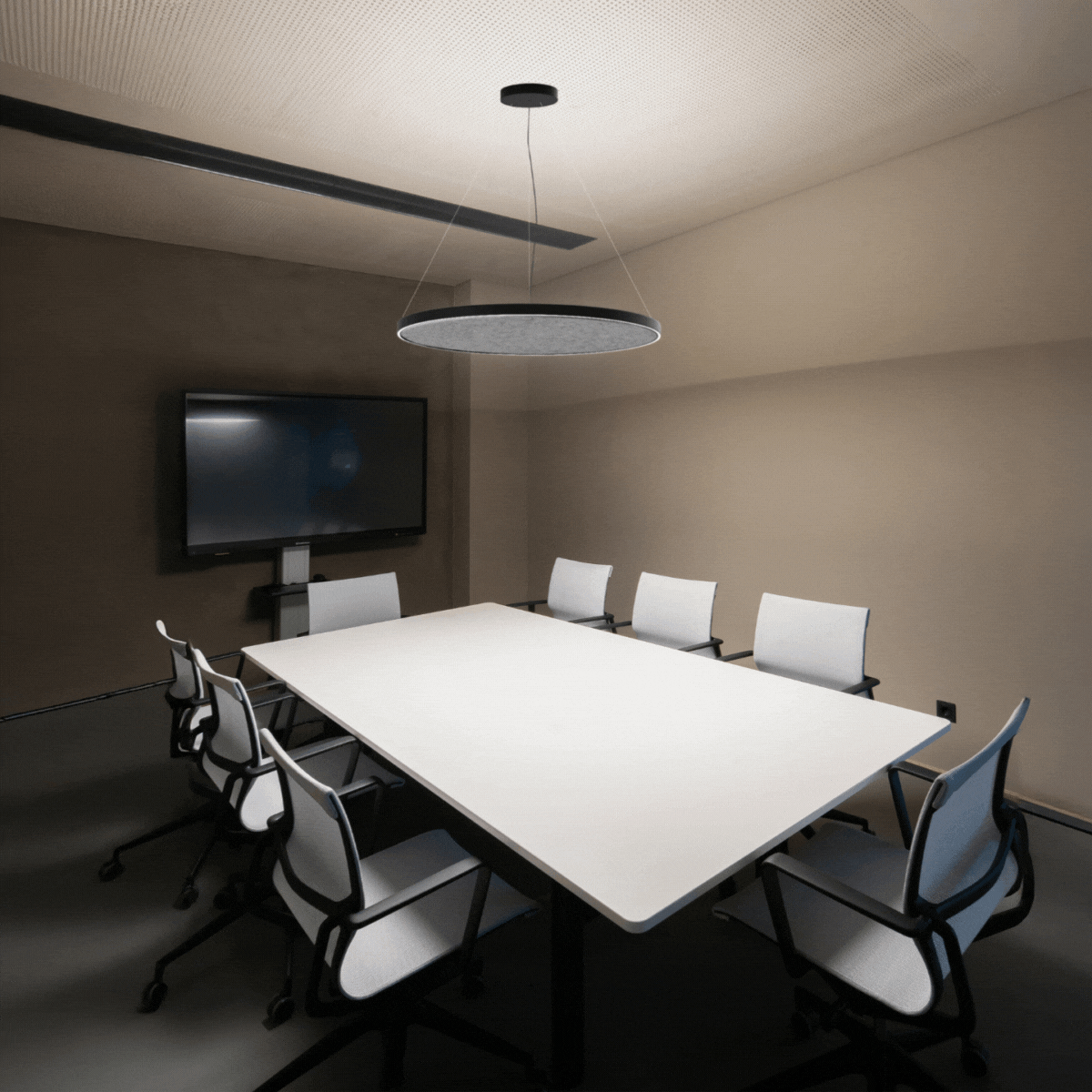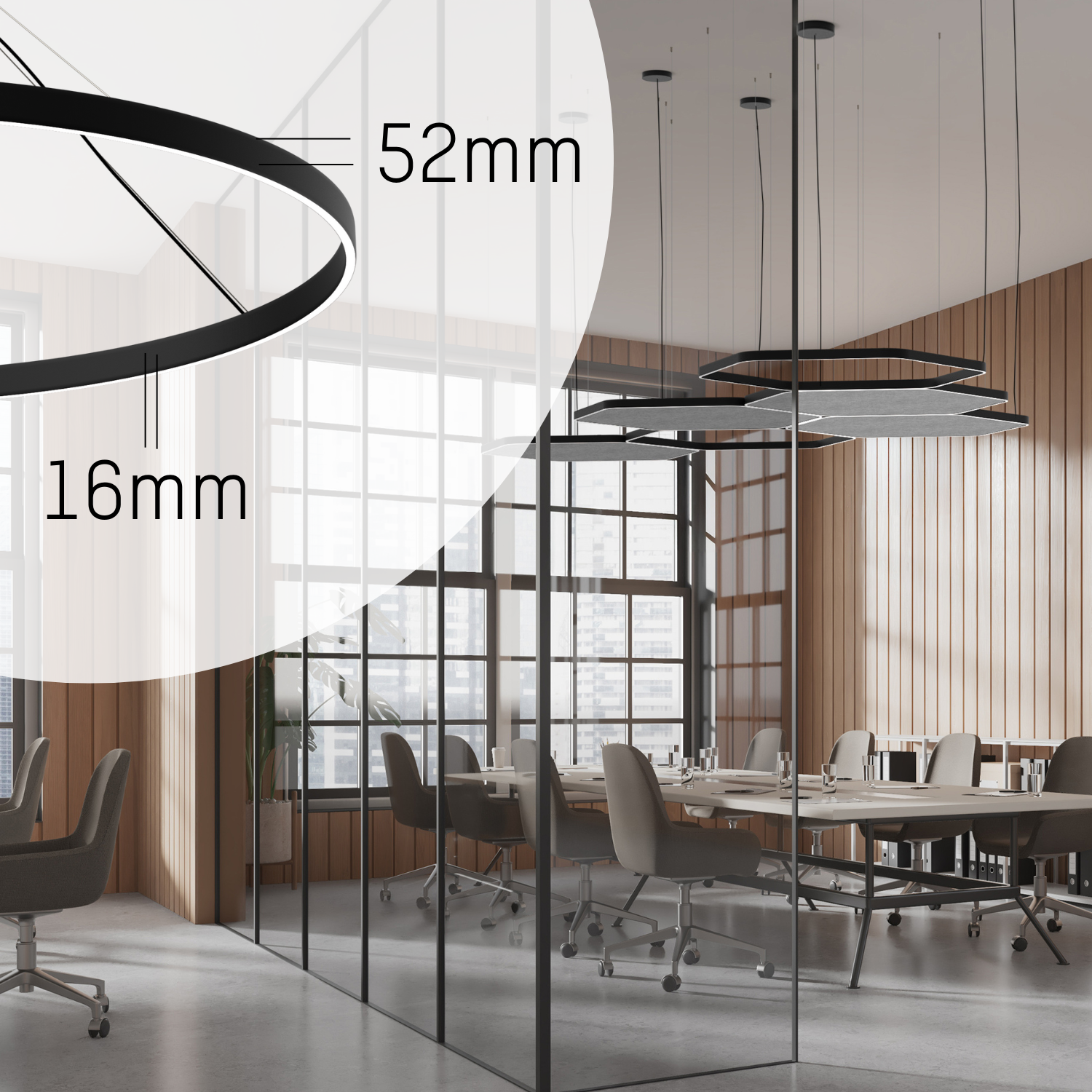 Design spaces with style and functionality using two sizes and shapes of the LON pendant luminaires in a minimalist design of 16 x 52 mm. The identical design of the lights and acoustic panels allows you to harmoniously combine lighting and acoustics, creating a pleasant sound atmosphere.